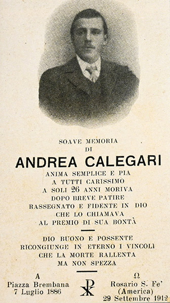 Immaginetta ricordo di Andrea Calegari di Piazza Brembana, morto a 26 anni in Argentina Datazione: 29 settembre 1912Luogo: Rosario, Santa Fé (Argentina) Articolo precedente: Omacini Giovan Battista Prec Articolo successivo: Mostacchi Santiago Giacomo Avanti