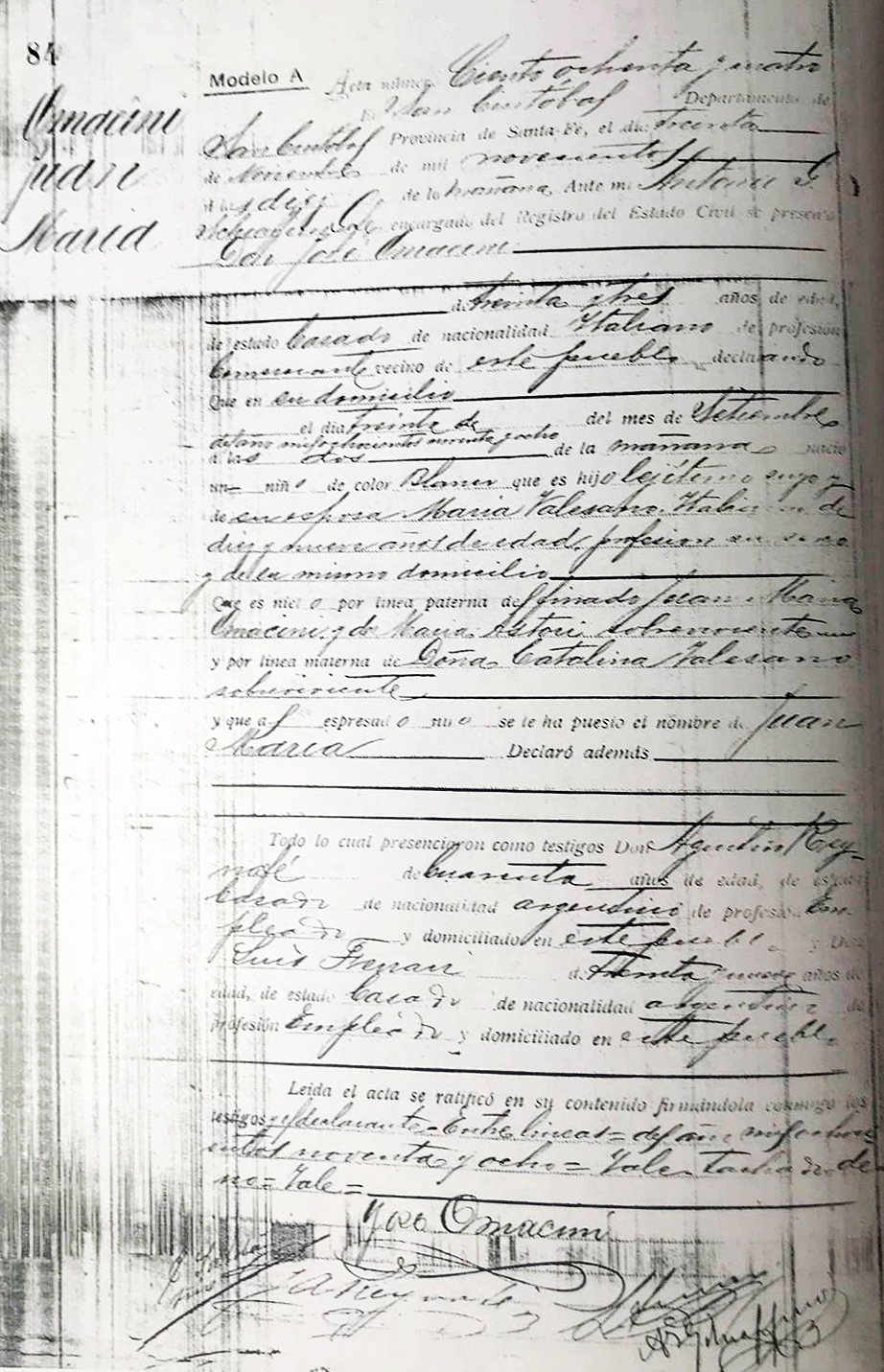 Descrizione: Atto di nascita di Juancito Omacini, figlio di Bepo.